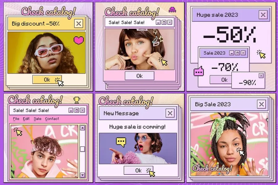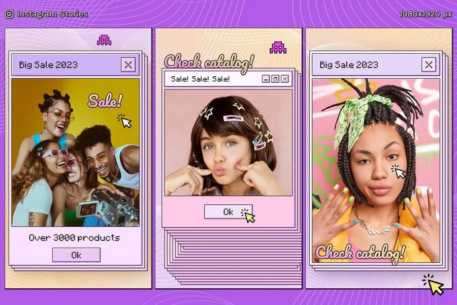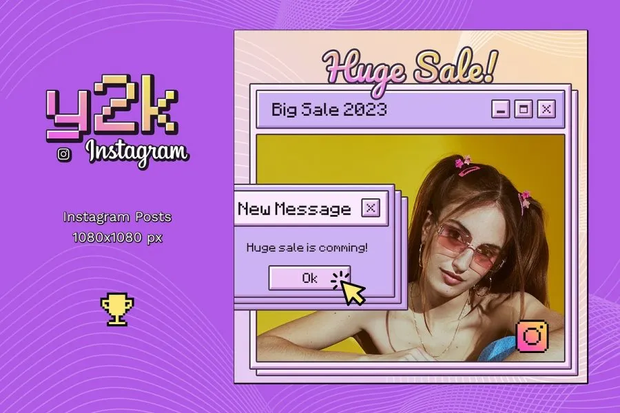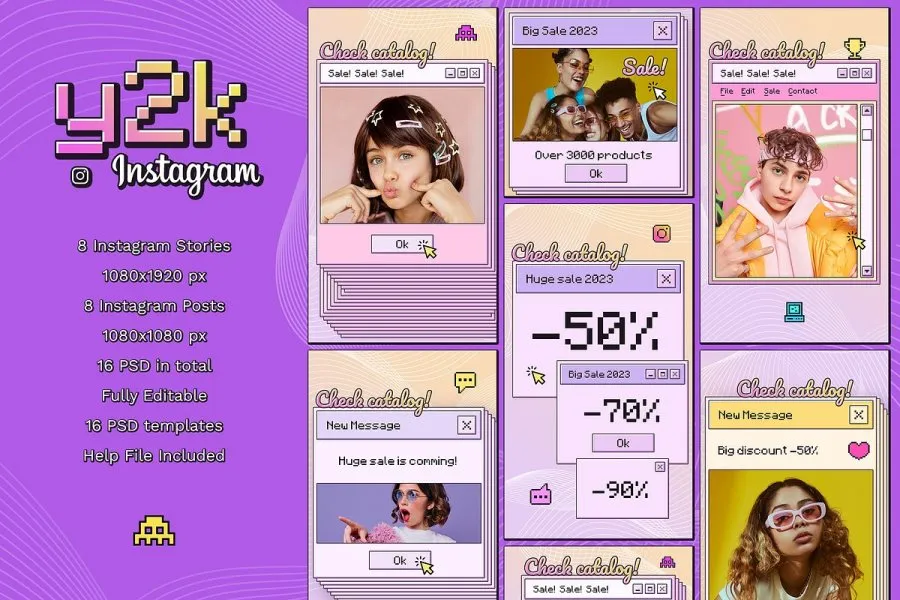 Y2K Instagram 帖子和故事 使用这些有趣的模板回到 2000 年。泡泡糖颜色让您心情愉快。可爱的复古界面元素带有一丝怀旧气息。几分钟内即可创建 Instagram 帖子和故事!此外,还适用于 Facebook!编辑文本并添加照片。非常简单!