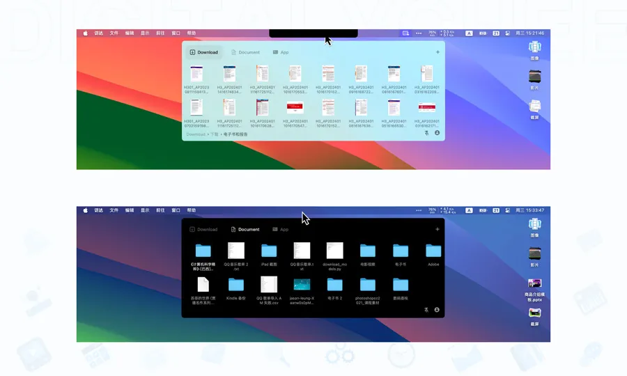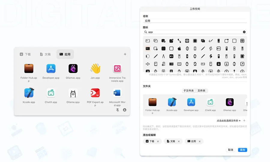 Folder Hub是一款隐藏在Mac刘海或菜单栏区域的文件浏览器,可通过鼠标停留/快捷键呼出,在工作空间内快速访问常用文件、目录、软件,并支持预览/分享/拖拽/删除等操作。