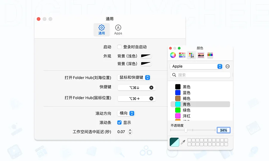 支持开机自启、调整滚动方向,以及自定义面板颜色/选中延迟秒数等