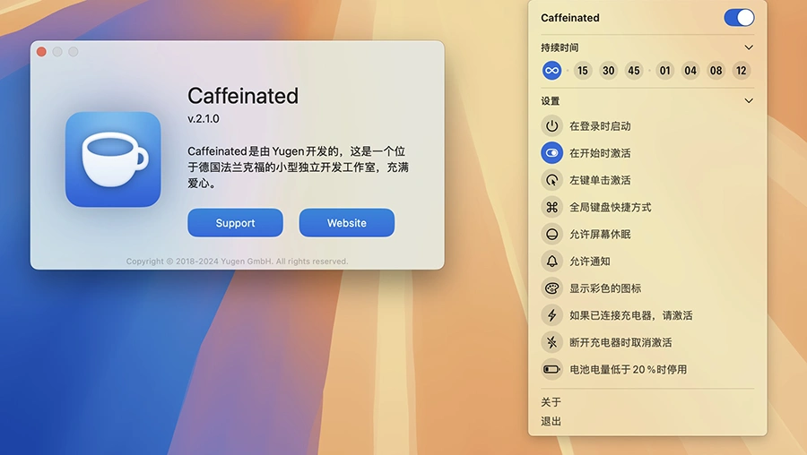 - 状态指示:显示当前防睡眠状态,用户可以随时查看 Caffeinated 是否处于激活状态。