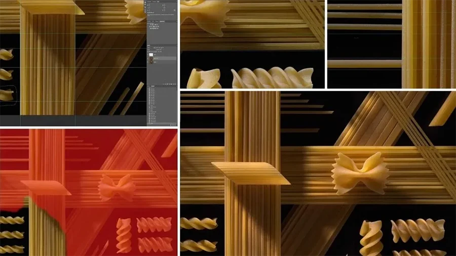决定将这张照片添加到他的专业作品集后,卡尔进行了一些细致的后期制作,以使其看起来恰到好处。这包括使用套索工具、液化过滤器、扭曲过滤器、标尺工具和旋转功能等一系列工具对意大利面外壳和意大利面条进行整形、重新排列和调整大小。