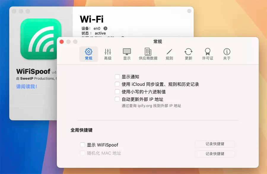 WiFiSpoof 是一款适配 macOS 的简洁高效 MAC 地址管理工具,通过随机化、自定义和规则触发,实现对网络环境的隐私保护与访问控制。它集成网络信息监控、历史回溯、快捷热键和自动应用机制,操作简便、反馈即时、运行稳定,是在公共 Wi‑Fi 环境中追求隐私、安全与便捷的 Mac 用户值得信赖的利器。