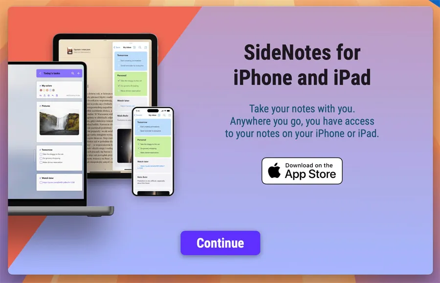 SideNotes 是一款专为 Mac 用户设计的高效侧边笔记应用,中文用户常称之为“SideNotes 侧边笔记”或简称“SideNotes”。它的核心定位是将笔记管理融入屏幕边缘,随时随地快速记录灵感、任务、代码片段或待办事项,极大提升工作效率。