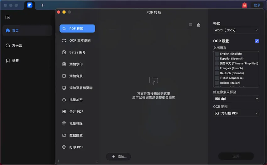 - 批量添加贝茨编号、水印、背景、页眉和页脚。