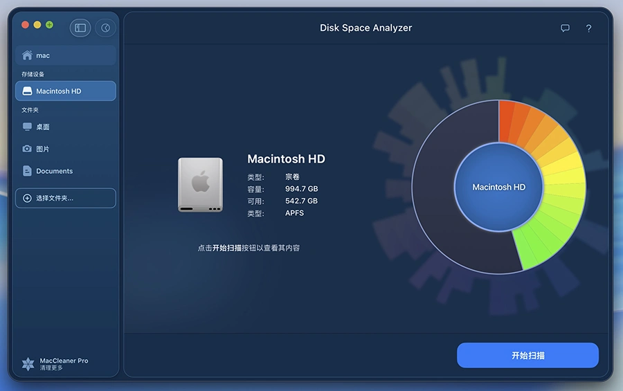 支持扫描任意磁盘卷(内建硬盘、外接 USB、挂载的 DMG 镜像、网络驱动器等),检测占用空间最多的部分。