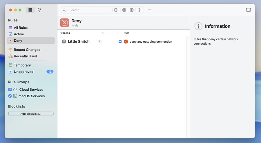 Little Snitch 6(中文名:小飞贼防火墙,简称 Little Snitch)是一款专为 macOS 打造的网络连接监控与防火墙工具,它能够实时拦截和管理应用的网络请求,帮助用户掌握数据流向并保护隐私安全。软件提供清晰的网络可视化界面,让用户能够直观了解每个应用的网络活动,从而更精准地控制数据传输。