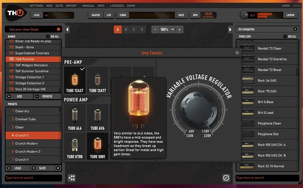 广泛的放大器和效果器模型: TH-U Premium 2 提供了超过 100 种精细模拟的放大器和 100 多种效果器模型。它涵盖了经典和现代的吉他/贝斯放大器,并且包含了 Overloud 自家开发的模型,以及来自知名品牌的授权模拟。