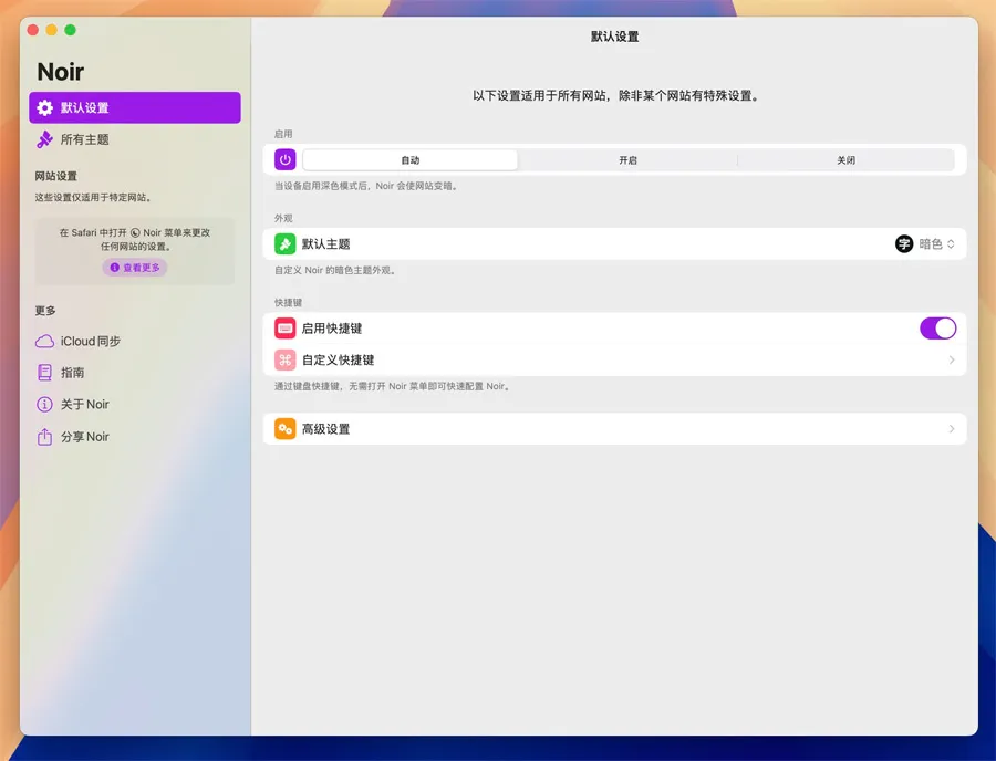 用户可以为每个网站设置独立规则,包括是否启用 Noir、是否随系统切换、是否使用特定色调等,实现个性化浏览。 - 快捷键与菜单栏控制