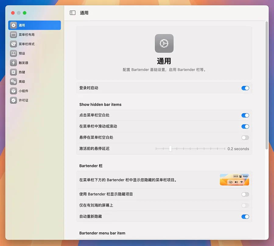 1. 自动隐藏与显示:支持将图标隐藏至 Bartender Bar,并在触发时自动显示。