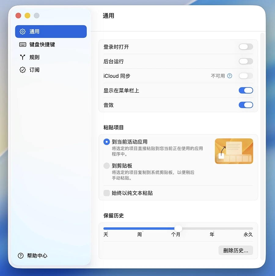 支持通过 iCloud 同步历史剪贴板到 iPhone、iPad 与其他 Mac 设备。 -