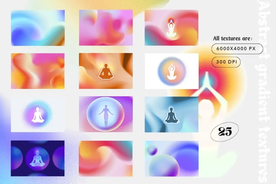 紧跟潮流,乐于创造怀旧的 Y2K 设计,光环渐变粒状纹理- 25 种流行粒状渐变纹理、16 种人体光环艺术和 25 种渐变形状的集合。您可以使用渐变为原本平淡的设计增加深度,为背景创建有趣的纹理,或为照片注入新的生命和色彩。