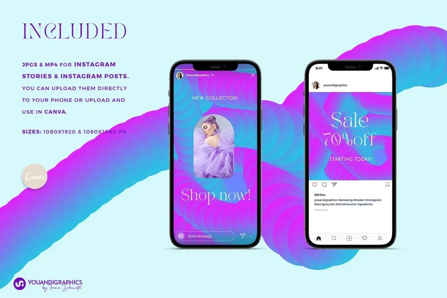 该套装还包括适合Instagram 帖子和 Instagram 故事大小的 JPG 图像,您可以将其直接上传到手机或任何社交媒体应用程序(例如Canva),并用作营销活动的背景。