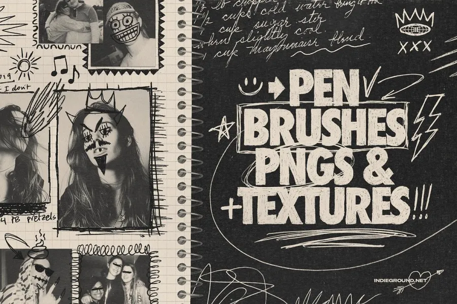 钢笔套件:Photoshop 笔刷、PNG 文件和额外纹理这款超棒的钢笔套件是您绘制、涂鸦和在数字艺术作品上涂鸦的全新资源。使用大量 PNG 笔触、形状和线条,轻松实现那种粗糙的剪贴簿美感,或者使用 5 种 Photoshop 笔刷自己绘制!