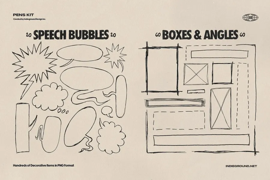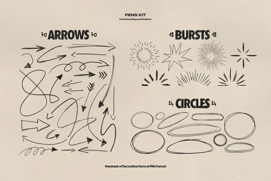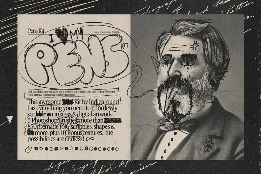 Indieground 的新 Pens Kit 是你能找到的最全面的笔包:850 多种透明 PNG,外加 5 种 Photoshop 画笔。让你的想象力飞翔,这些工具会完成剩下的工作!