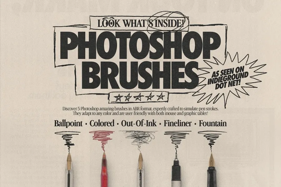 - 5 个适用于 Photoshop 的 .ABR 画笔,包括以下标记笔刷:圆珠笔、彩色笔(红、蓝、绿)、没墨的笔、细线笔、钢笔