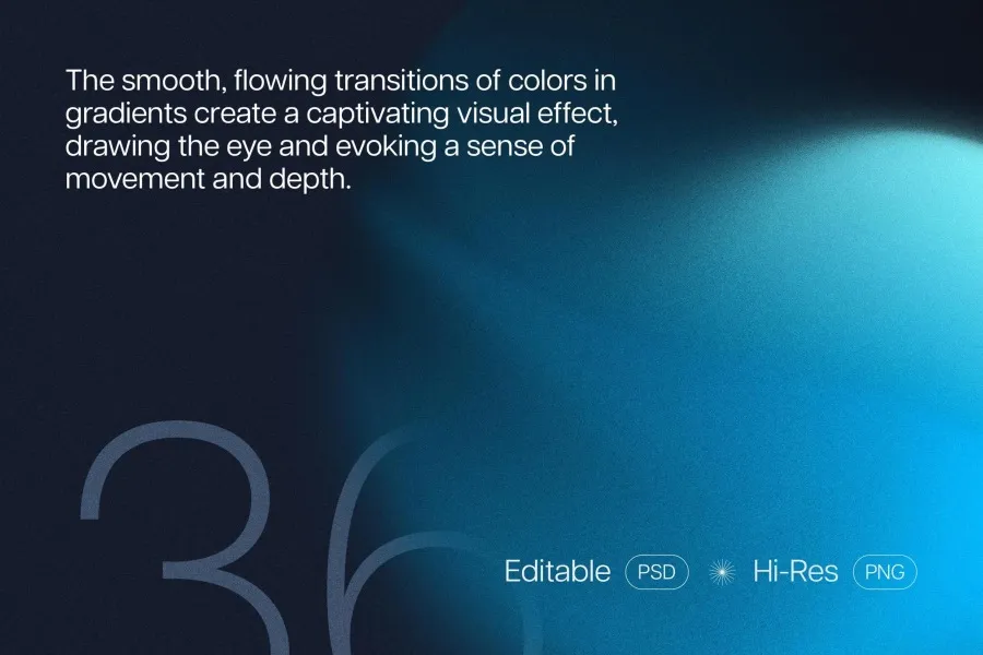- 36 种渐变纹理,JPG 格式(5000×5000 像素,300 dpi),有噪点和无噪点,涵盖 6 种配色方案;