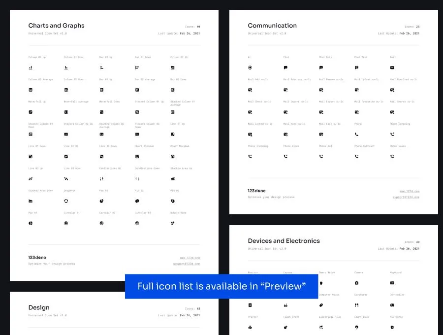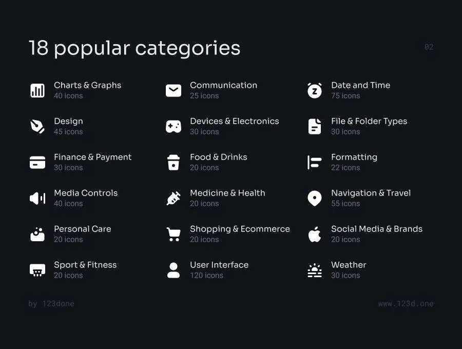 18 个类别:图表和图形、通信、日期和时间、设计、设备和电子产品、文件和文件夹类型、金融和支付、食品和饮料、格式化、媒体控件、医药和健康、导航和旅行、个人护理、购物和电子商务、社交媒体和品牌、运动和健身、用户界面、天气