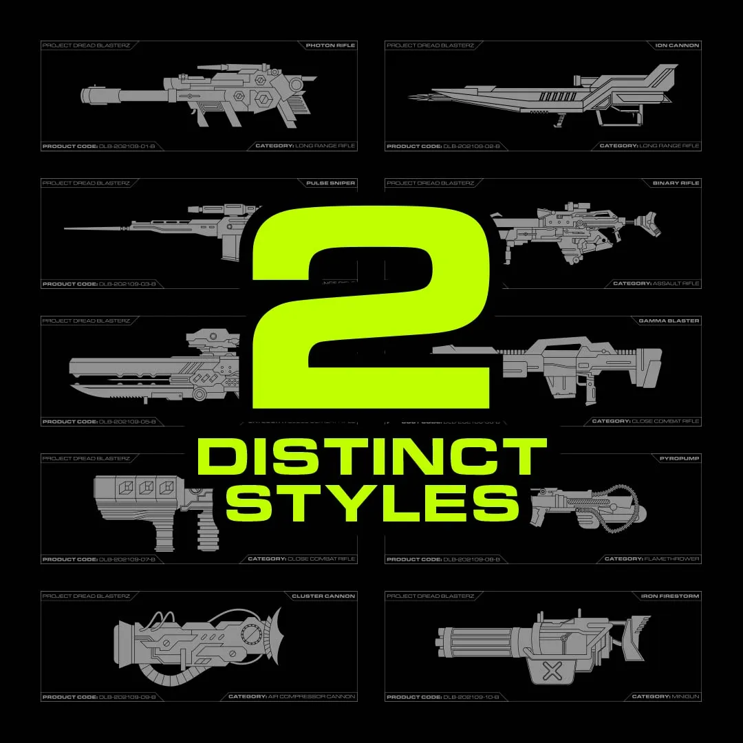 - 独特的造型选择: Dread Blasterz 中的每件武器都有专属的名称、产品代码和两种独特的风格。第一种风格强调轮廓,类似蓝图;而第二种风格则以实心填充的形状和镂空线条为特色。这种灵活性让您可以根据自己的设计需求定制外观。