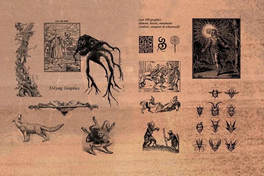 真实而神秘的起源:通过从 14 至 18 世纪的书籍和版画中提取并精心清理的图形,深入探究历史深处。这种真实的触感为您的设计增添了深度和历史魅力。 现代与古代的碰撞: 除了历史元素外,死灵之书还拥有采用人工智能创建的图形,将新旧元素独特地融合在一起。 丰富的收藏: 该包拥有超过 310 种 PNG 格式的图形,提供了无与伦比的多样性和深度,确保您拥有适合每个项目的完美元素。 用户友好的工具: 包括一个可轻松修改颜色的 Photoshop 动作和一个快速的“使用方法”视频,使任何技能水平的艺术家和设计师都可以使用。 敢于设计不同: 非常适合需要一点神秘、玄妙或彻头彻尾的神秘感的项目。无论是主题品牌、概念艺术还是独特的数字创作,死灵之书都是您的首选资源。