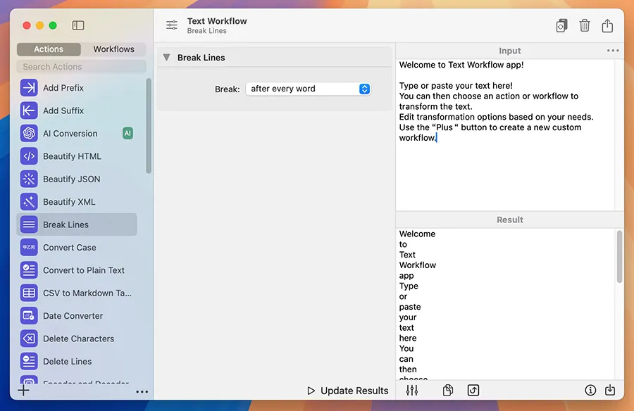 在 Mac 上使用 Text Workflow,你会觉得非常顺畅。界面清晰直观,操作逻辑简单:选择文本、应用一个或多个操作,然后立刻看到结果。应用占用资源并不高,即使处理较大文本也不会明显卡顿。工作流可保存、组织并在菜单栏或快捷键中快速调用,无需每次重复操作。iCloud 同步可确保你在 Mac 与其他设备间共享和复用这些工作流。整体体验非常贴近实际使用场景,让繁琐的文本处理变得轻松愉悦。