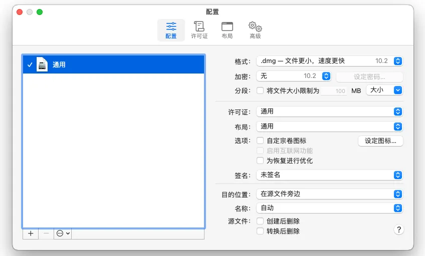 支持创建DMG、ZIP、CD/DVD映像、SPARSEBUNDLE等多种格式,并可设置是否加密、压缩或分卷,满足不同分发或备份需求。