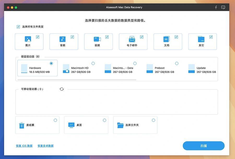 可针对内置硬盘、外接硬盘、USB 驱动器、SD/CF 卡、相机存储卡等设备进行扫描与恢复。 -