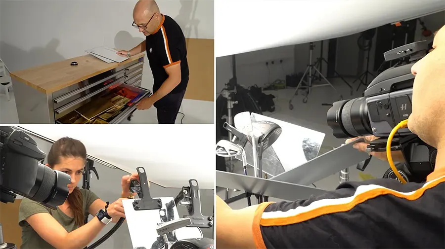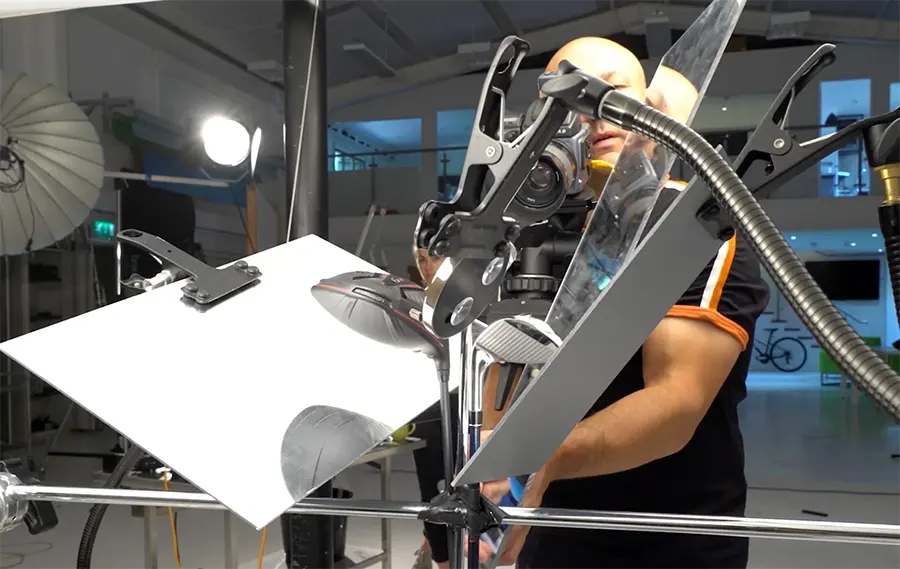 当卡尔在拍摄过程中工作时,你将看到他如何完成构图,照亮球杆的金属表面,使用反光板和旗帜来增强和控制照明,并使用聚焦叠加克服景深问题。