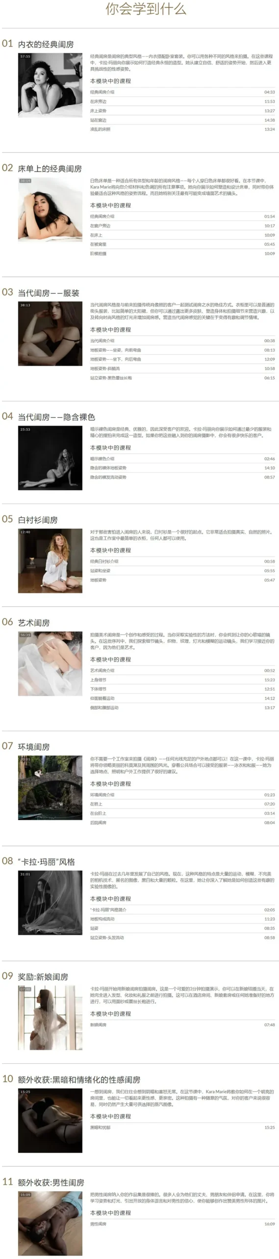 闺房摄影是一种受欢迎的、利润丰厚的类型,有多种类型的人就有多种风格和可能性。在Kara Marie2019年基础“闺房系列”课程的续集中,你将体验12个独特主题的闺房拍摄,探索闺房类型中最畅销和最受欢迎的风格。你将学习内幕摆姿势和造型技巧来捕捉你的客户会喜欢的图像,你将获得伟大的想法来推动你自己的有趣实验。