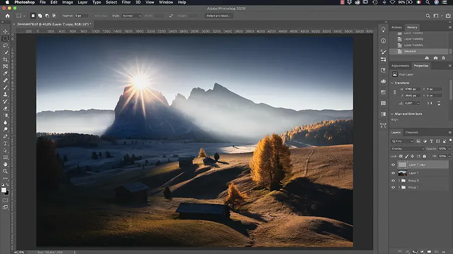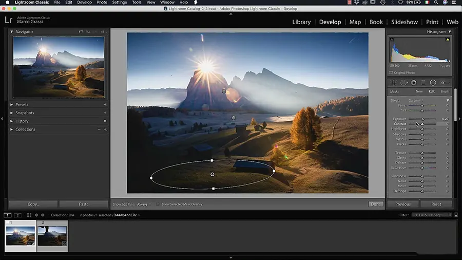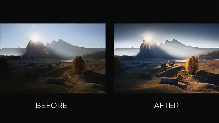 我在一个非常晴朗的秋日在多洛米蒂山脉拍摄了这张照片。当我到达那里时,一开始场景有点平坦,所以我不得不等待太阳从山峰上升起,以便光线开始塑造景观。一旦发生这种情况,场景就开始运行良好,但是仍然有很多工作要做,正如您从下面的之前/之后看到的那样。